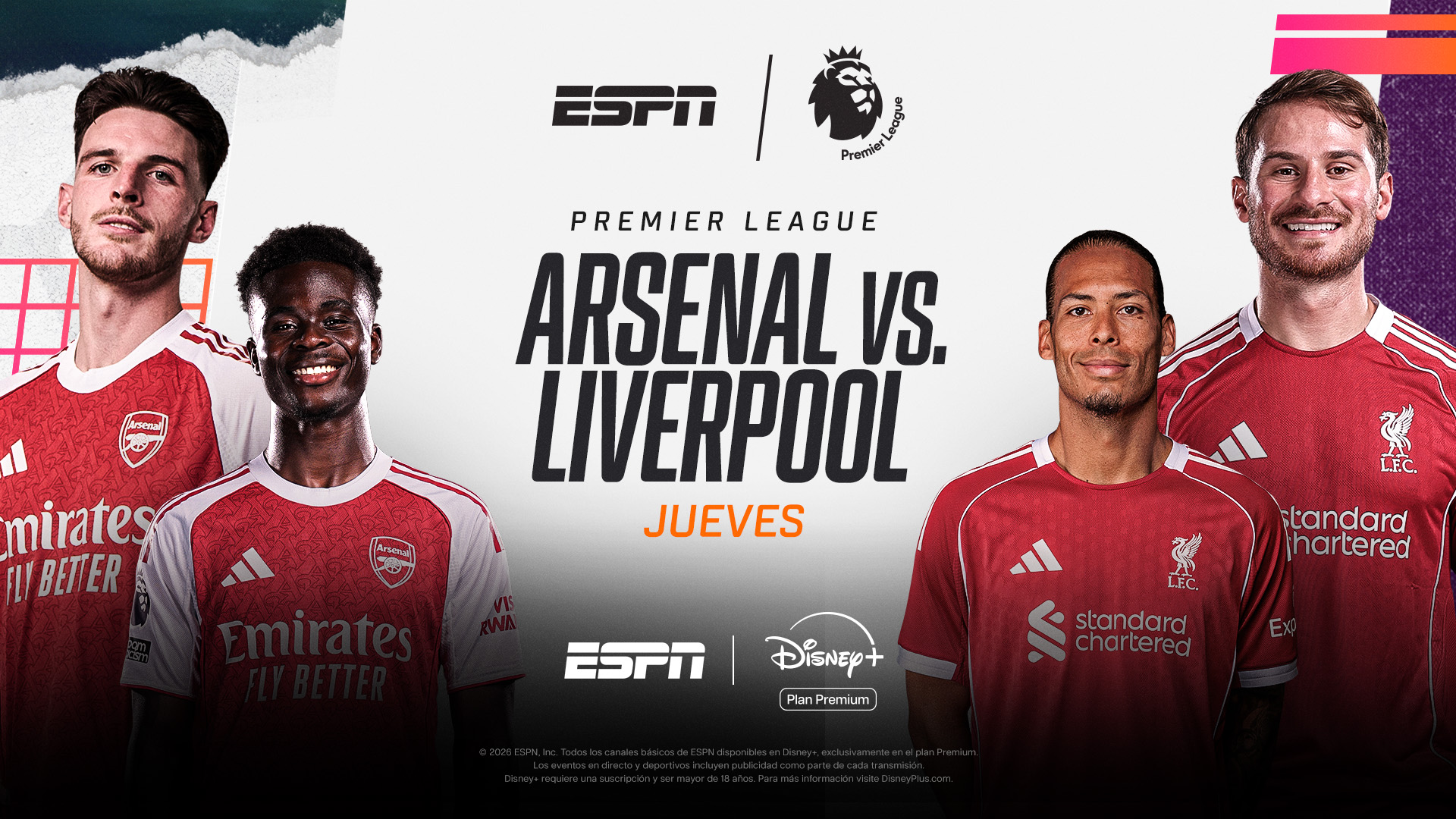 15:45 ESPN y Disney+ Plan Premium / Premier League Fecha #21 – Arsenal vs. Liverpool