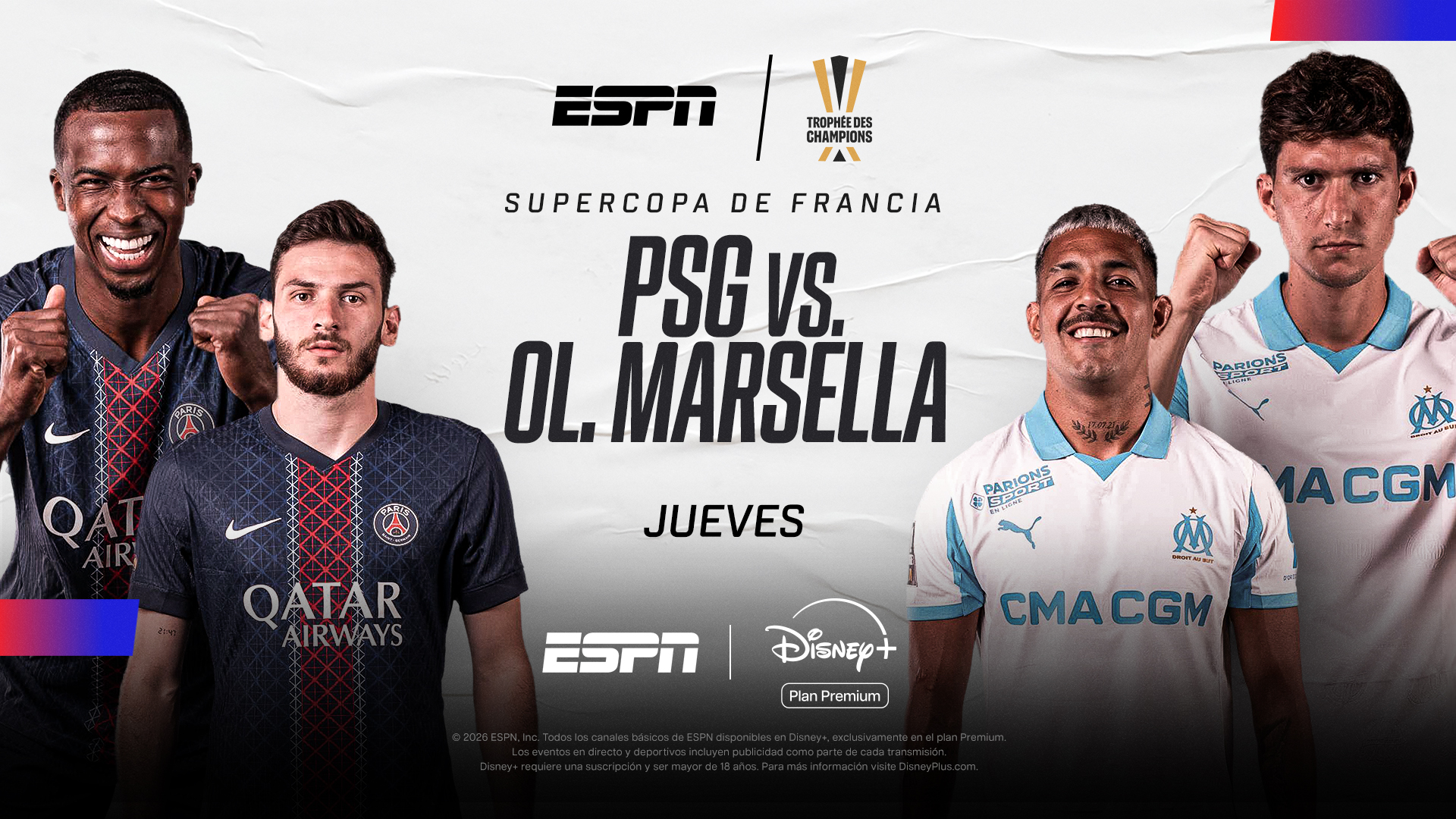 13:45 ESPN2 y Disney+ Plan Premium / Trofeo de Campeones – PSG vs. Olympique Marseille