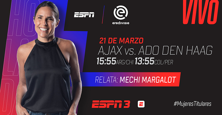 La Eredivisie de Holanda, una liga que se caracterizada por su buen fútbol, dinámica y velocidad, tendrá a partir del domingo 21 de marzo una nueva voz en sus transmisiones por ESPN Latinoamérica, puesto que Mechi Margalot se convertirá en la primera relatora de fútbol.