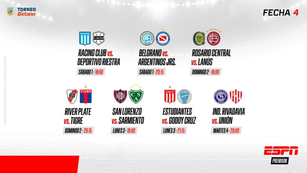 Llega un nuevo fin de semana cargado de emocionantes partidos, con el inicio de la fecha #4 de la Liga Profesional del Fútbol Argentino 2024. El sábado 1° de junio, desde las 18:00, Racing, uno de los punteros, recibirá a Deportivo Riestra. El domingo 2, a las 20:15, River enfrentará a Tigre y el lunes 3, a las 19:00, San Lorenzo, que aún no conoce la victoria en el certamen, recibirá a Sarmiento. Los tres partidos serán transmitidos en VIVO por ESPN Premium