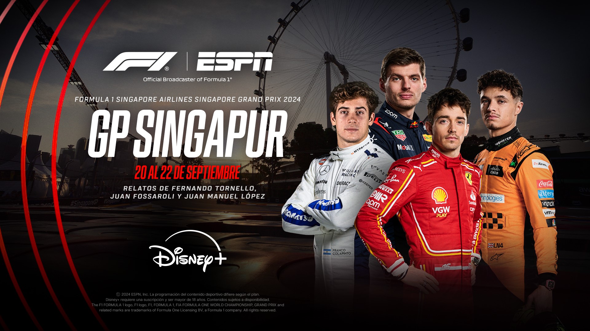 ¡Las luces brillan con intensidad en el circuito de Marina Bay para el GP de Singapur! Desde su debut el 25 de octubre de 2008, este circuito ha sido pionero como la primera carrera nocturna en la historia de la Fórmula 1. Ahora se prepara para recibir la 18ª fecha del campeonato mundial, prometiendo una noche llena de adrenalina y acción con la inigualable cobertura de ESPN para los suscriptores de Disney+.