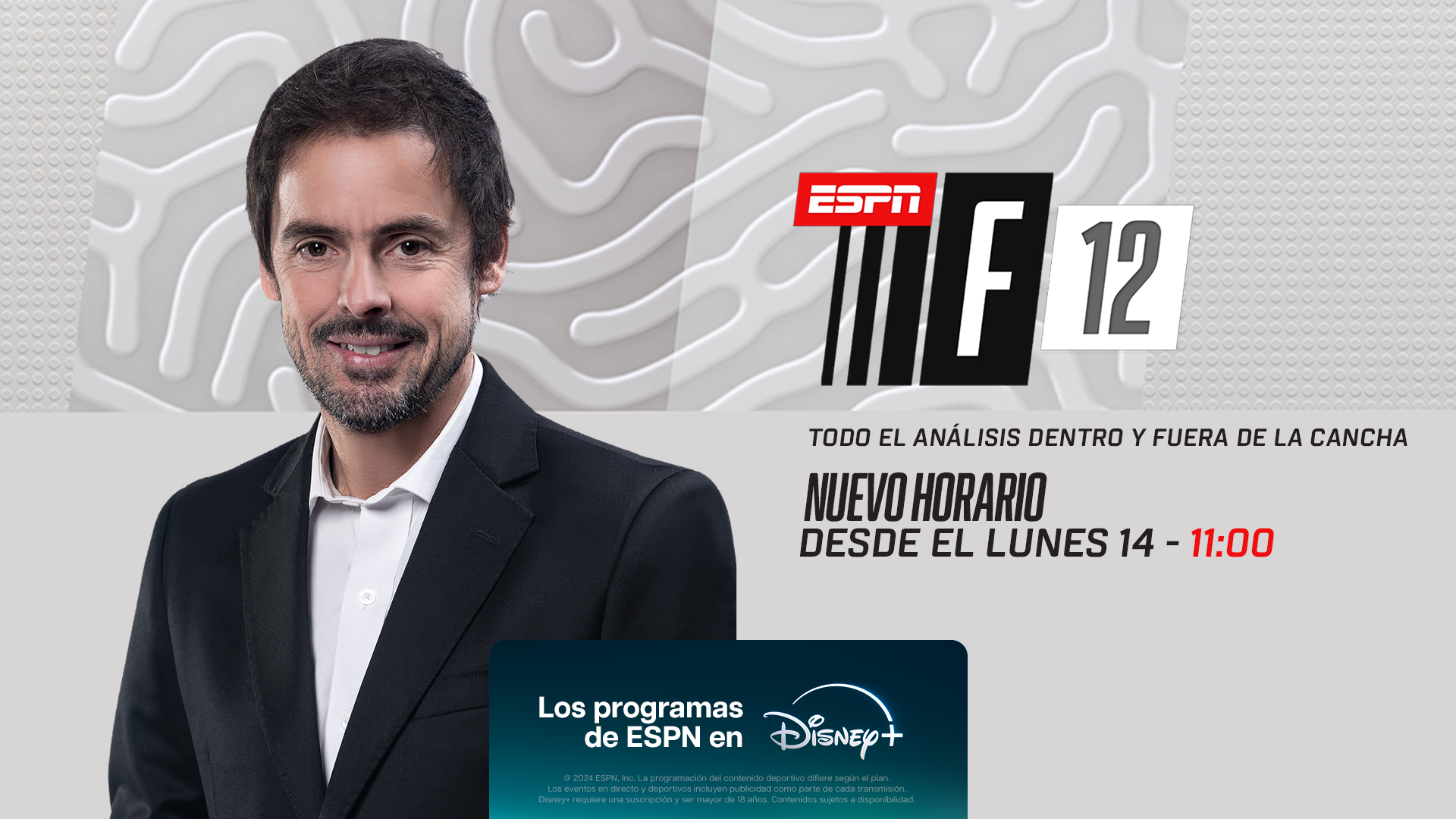 Desde el lunes 14 de octubre, ESPN F12 que conduce Mariano Closs adelantará su horario de comienzo a las 11:00 y se extenderá por dos horas. Este show de fútbol, que brinda una resonante propuesta informativa de todos los equipos argentinos, cuenta con un panel integrado por Esteban Edul, Leo Gabes, Leo Paradizo, Martín Costa, Nicolás Distasio, Lola Del Carril y el exfutbolista Mariano Juan. Además, se destaca la participación de periodistas en vivo desde los entrenamientos de los clubes más destacados del fútbol argentino.