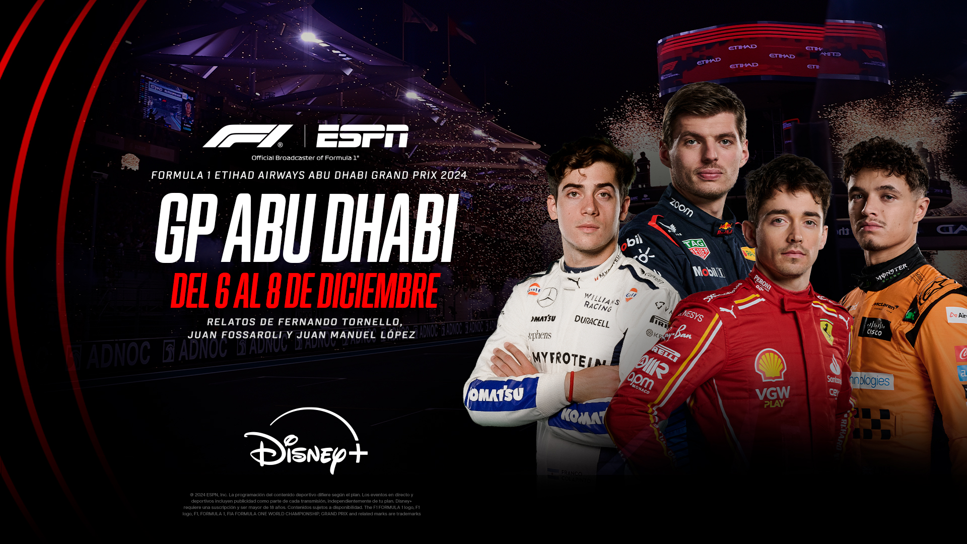 ESPN trae a DISNEY+ la última prueba del año de F1 en Abu Dhabi, con Colapinto en pista
