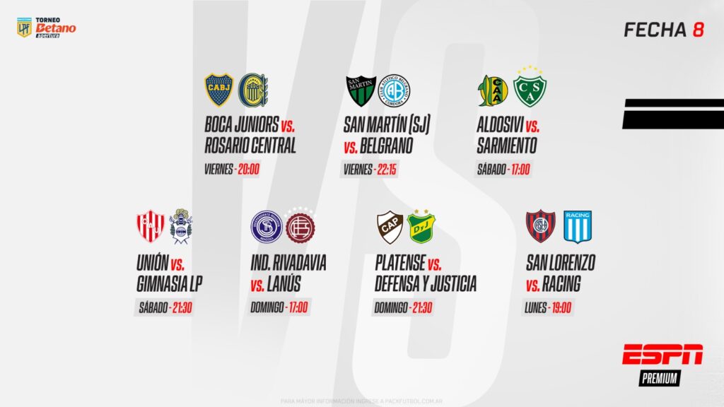 Los 7 partidos por ESPN Premium: viernes 28, Boca Juniors-Rosario Central y San Martín (SJ)-Belgrano; sábado 1°, Aldosivi-Sarmiento y Unión-Gimnasia; domingo 2, Independiente Rivadavia-Lanús y Platense-Defensa, y lunes 3, San Lorenzo-Racing La Liga Profesional del Fútbol Argentino 2025 no da respiro y, como apertura de su octavo capítulo, ofrece un partidazo interzonal: Boca Juniors recibe a Rosario Central en La Bombonera, este viernes 28 de febrero, desde las 20:00. Para cerrar la fecha, el lunes 3 de marzo, a las 19:00, San Lorenzo y Racing chocarán en un clásico que promete grandes emociones. Todos estos encuentros se podrán disfrutar en VIVO por ESPN Premium.