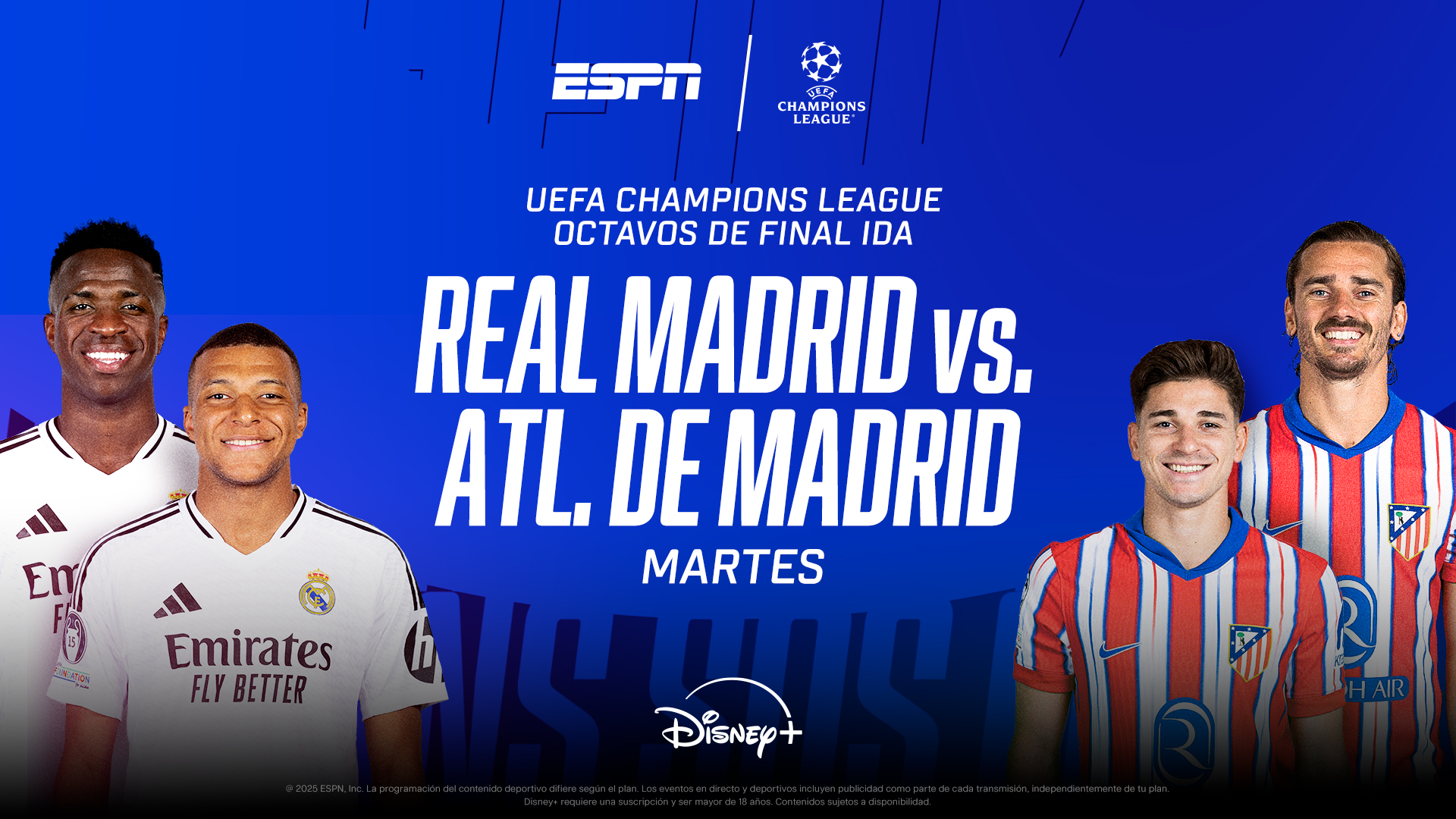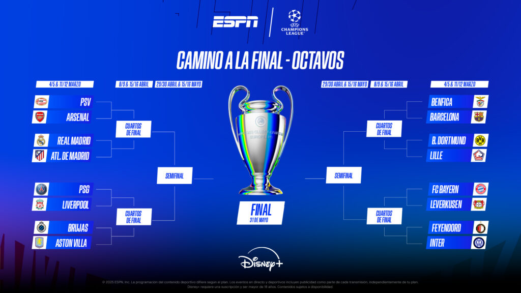 La UEFA Champions League entra en su fase decisiva con los partidos de ida de los octavos de final. El martes 4 y miércoles 5 de marzo por ESPN y Disney+ se emitirán los 8 encuentros, incluyendo el esperado derbi Real Madrid vs. Atlético de Madrid. Además, el jueves 6 continuará la acción con la UEFA Europa League y la UEFA Conference League.