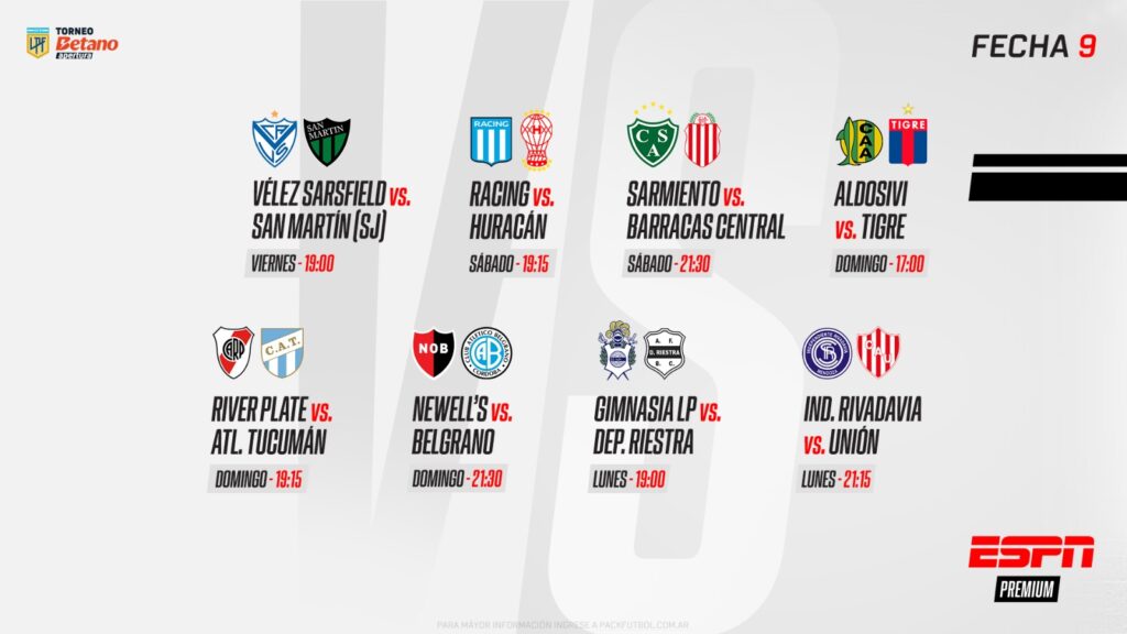 Por ESPN Premium: viernes 7, Vélez-San Martín (SJ); sábado 8, Racing-Huracán y Sarmiento-Barracas; domingo 9, Aldosivi-Tigre, River-Atlético Tucumán y Newell’s-Belgrano, y lunes 10, Gimnasia-Riestra e Independiente Rivadavia-Unión