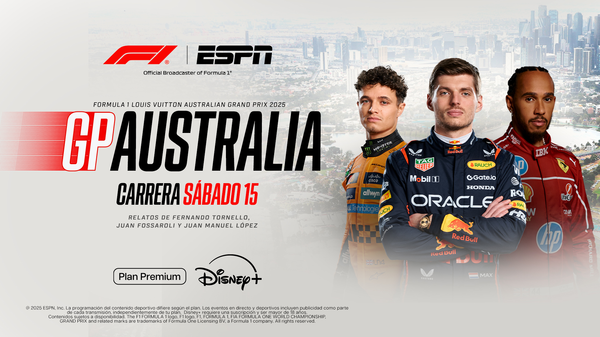 La amplia cobertura por ESPN en Disney+ tendrá a Fernando Tornello, Juan Fossaroli y Juan Manuel López en relatos y comentarios, con la posibilidad para los suscriptores del Plan Premium Disney+ de acceder a las distintas cámaras on board disponibles. Además, las actividades que giran alrededor de las carreras se pueden disfrutar en las previas y post, como así también todos los jueves se emite El Show de la F1.