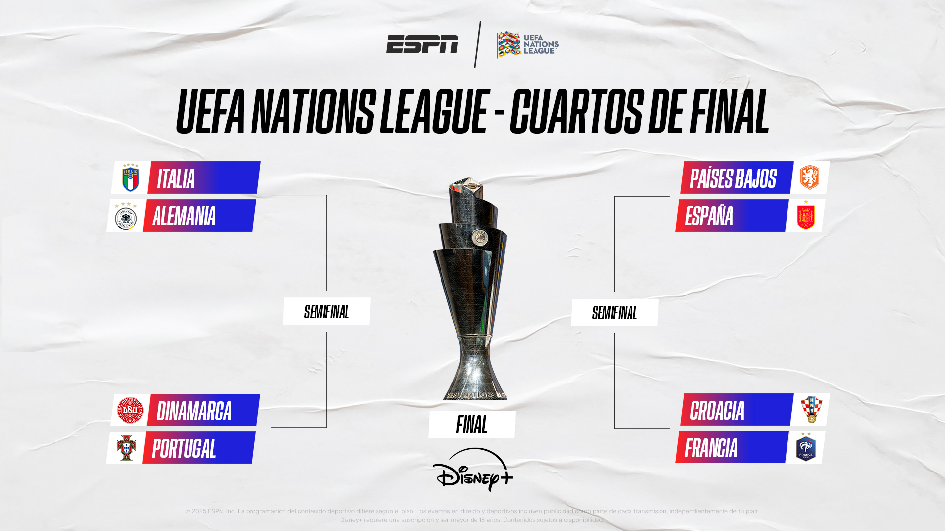 Desde el jueves 20 hasta el domingo 23 de marzo se jugarán los cuartos de final (partidos de ida) de la cuarta edición de la UEFA Nations League. Esta emocionante competencia, que reúne a las mejores selecciones de fútbol y a grandes figuras del Viejo Continente, se podrá disfrutar en vivo por ESPN y Disney+.