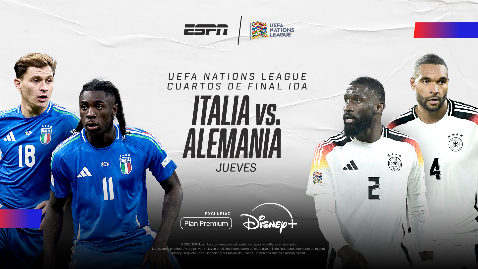 16:30 Disney+ / ESPN – UEFA Nations League – Cuartos de Final (Vuelta) – Alemania vs. Italia