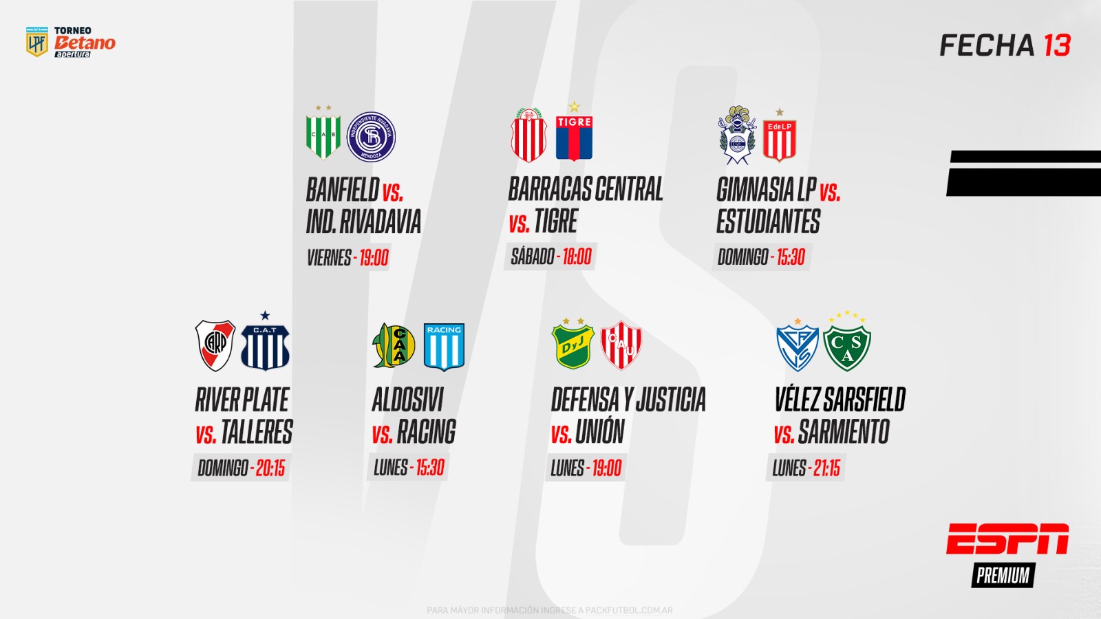 Siete partidos por ESPN Premium: viernes 11, Banfield-Independiente Rivadavia; sábado 12, Barracas Central-Tigre; domingo 13, Gimnasia-Estudiantes y River-Talleres, y lunes 14, Aldosivi-Racing, Defensa y Justicia-Unión y Vélez-Sarmiento