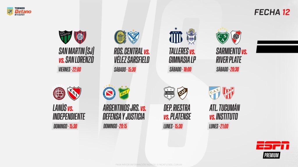 La Liga Profesional del Fútbol Argentino 2025 comienza a acercarse al final de su primera fase. En la fecha #12, son tres los partidos que más se destacan: San Lorenzo visita a San Martín de San Juan el viernes 4, a las 22:00, River Plate viajará a Junín para enfrentar a Sarmiento el sábado 5, a las 20:30, e Independiente choca con Lanús en La Fortaleza el domingo 6, desde las 15:30. Todos estos encuentros se podrán ver en VIVO por ESPN Premium.