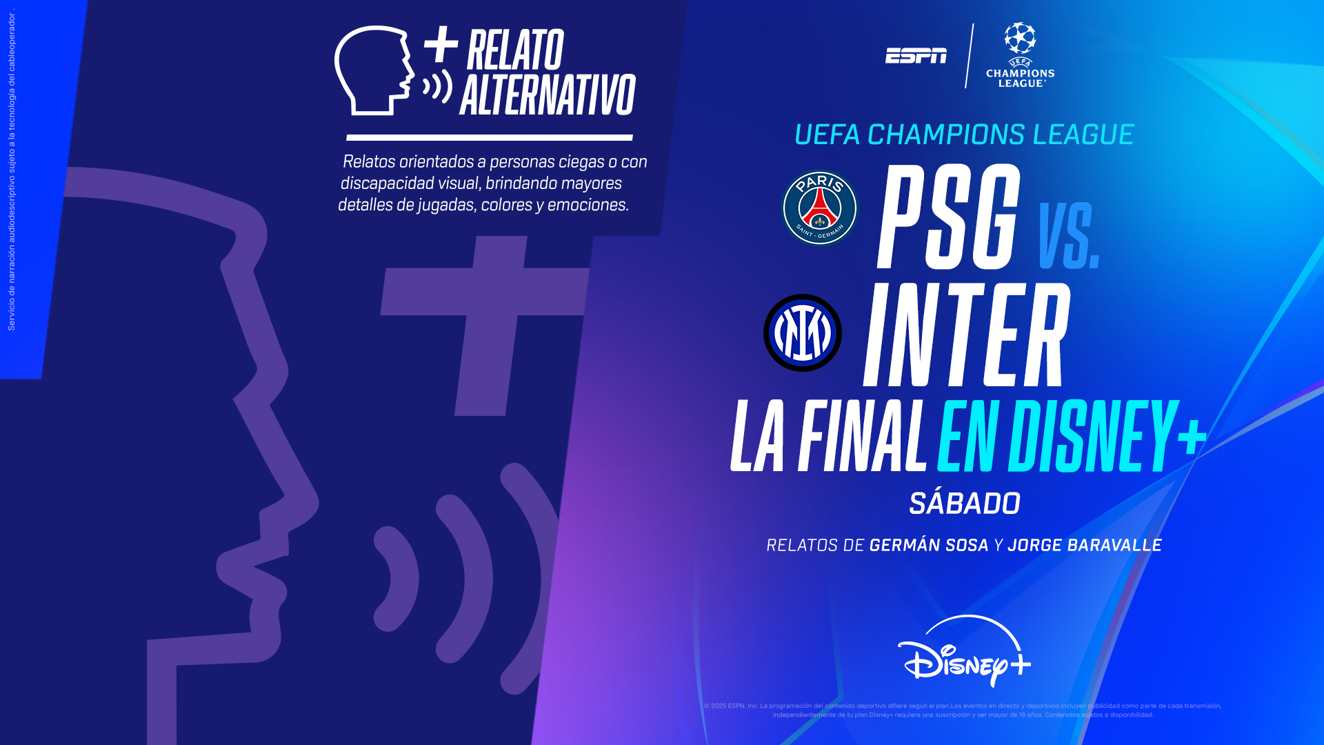 La anhelada final se podrá ver en VIVO por ESPN y Disney+, con los relatos de Mariano Closs y los comentarios de Diego Latorre, más el apoyo de Miguel Simón y Gemma Soler. Además, estará disponible la opción del relato alternativo, con audio-descriptivo para personas con discapacidad visual, a cargo de Germán Sosa y Jorge Baravalle.