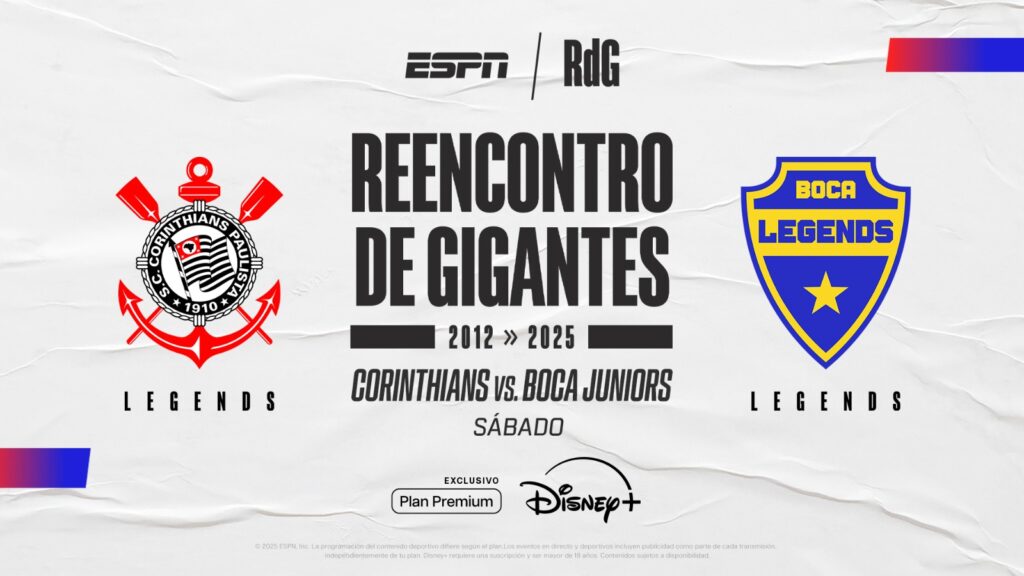Este sábado 5 de julio, desde las 14:50 (ARG), históricos exjugadores de Boca Juniors se medirán con un equipo similar de Corinthians en el denominado “Reencontro de Gigantes”, partido amistoso que se disputará en el Estadio Pacaembú de San Pablo y los suscriptores del Plan Premium Disney+ lo podrán disfrutar en VIVO.