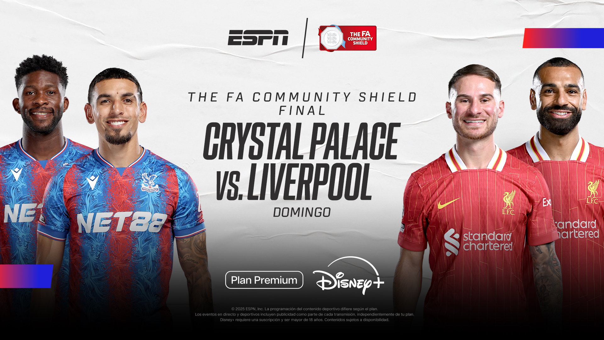 Además, el domingo próximo jugarán Liverpool y Crystal Palace, últimos campeones de la Premier League y de la FA Cup, respectivamente, por la FA Community Shield, en vivo por ESPN y para los suscriptores del Plan Premium Disney+