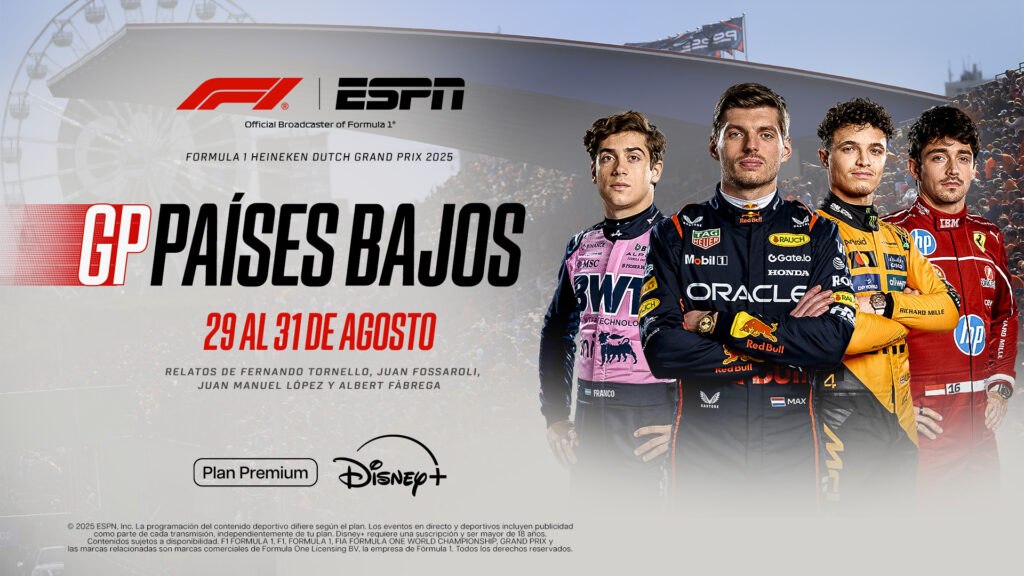 La F1 y la F1 Academy regresan a la acción en Zandvoort del 29 al 31 de agosto, con cobertura completa para los suscriptores del Plan Premium Disney+. Con cámaras on-board, la innovadora Race Hub y la transmisión especial de F1 Kids, se podrá disfrutar de una experiencia única, además de las prácticas, clasificaciones y las carreras
