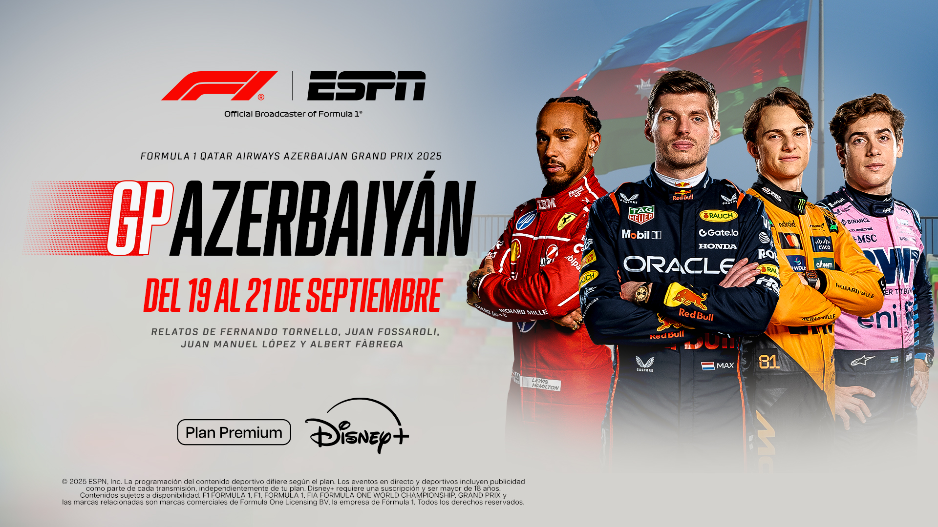La F1 y la F2 acelerarán por las calles de Bakú, la capital azerí, del 19 al 21 de septiembre, con cobertura completa para los suscriptores del Plan Premium Disney+. Todas las sesiones de la competencia, cámaras on-board, Race Hub y entrevistas exclusivas estarán disponibles para disfrutar un fin de semana a pura adrenalina y velocidad