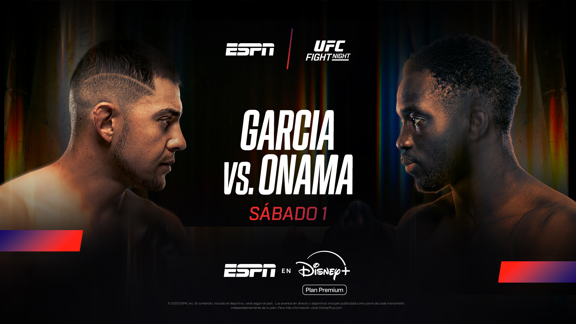 Los ascendentes Steve Garcia y David Onama encabezarán una nueva edición del UFC este sábado 1° de noviembre, desde el APEX de Las Vegas, en una cartelera que también tendrá presencia latina con el dominicano Waldo Cortés Acosta, el cubano Yadier del Valle y la mexicana Montserrat Ruiz. Todo en vivo por ESPN KNOCKOUT en el Plan Premium Disney+