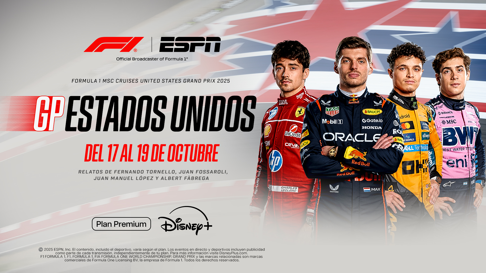Los suscriptores del Plan Premium Disney+ podrán disfrutar cada instante con los relatos y comentarios de Fernando Tornello, Juan Fossaroli, Juan Manuel López y Albert Fàbrega. La cobertura de ESPN incluye todas las prácticas, clasificaciones y carreras, junto a la experiencia Race Hub, que incluye la señal principal con datos en tiempo real y las cámaras on-board en el Ferrari de Lewis Hamilton y en el Alpine de Franco Colapinto.