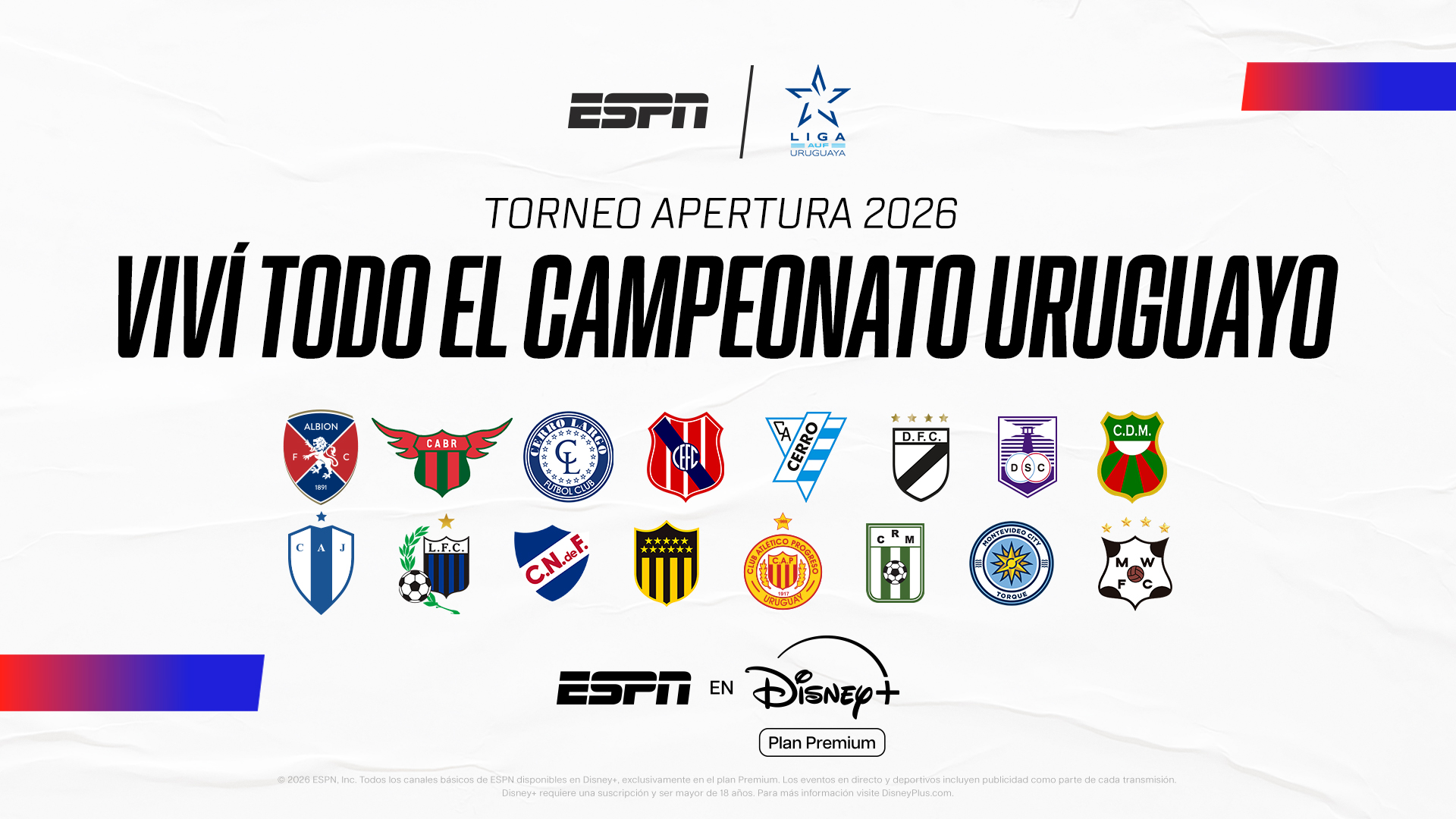 ATENCIÓN URUGUAY // ESPN trae a Disney+ Plan Premium la fecha #2 del Torneo Apertura 2026 de la Liga AUF Uruguaya, con el estreno de Nacional ante su gente